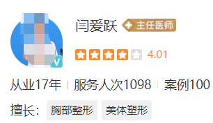 醫(yī)生介紹:閆愛(ài)躍主任醫(yī)師,從事整形外科多年,醫(yī)生作為一名畢業(yè)于正規(guī)院校的專(zhuān)家,他對(duì)于手術(shù)的了解是比較豐富的,因此他的指導(dǎo)向來(lái)都比較詳細(xì)。同時(shí),醫(yī)生也會(huì)關(guān)注大眾審美的變化和趨勢(shì),以自己的手術(shù)效果符合患者的期望和大眾審美的標(biāo)準(zhǔn)。因此,醫(yī)生的審美水平往往是棒的,能夠?yàn)榛颊咛峁└哔|(zhì)量的整形服務(wù)。