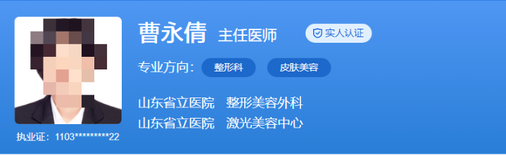 醫(yī)生介紹:曹永倩醫(yī)生曾在山東大學(xué)進(jìn)行博士后研究,擁有多年的整形美容外科臨床經(jīng)驗,對各類整形美容手術(shù)和激光治療有著深入的研究和實踐。她擅長應(yīng)用激光等光電技術(shù)治療皮膚色素性、血管性疾病等,同時在面部皮膚年輕化、毛孔粗大、永久脫毛等方面也有豐富的經(jīng)驗和獨特的技術(shù)。